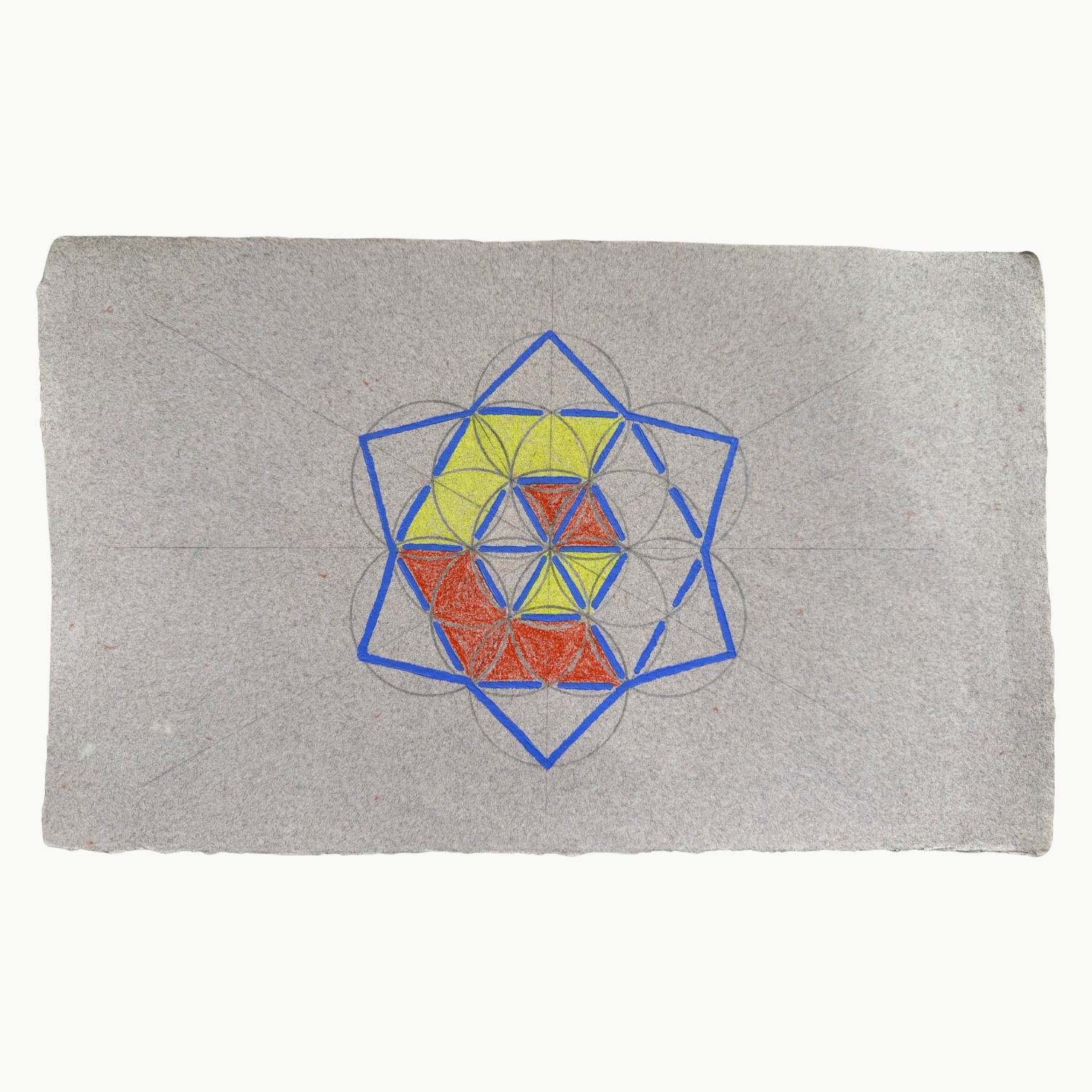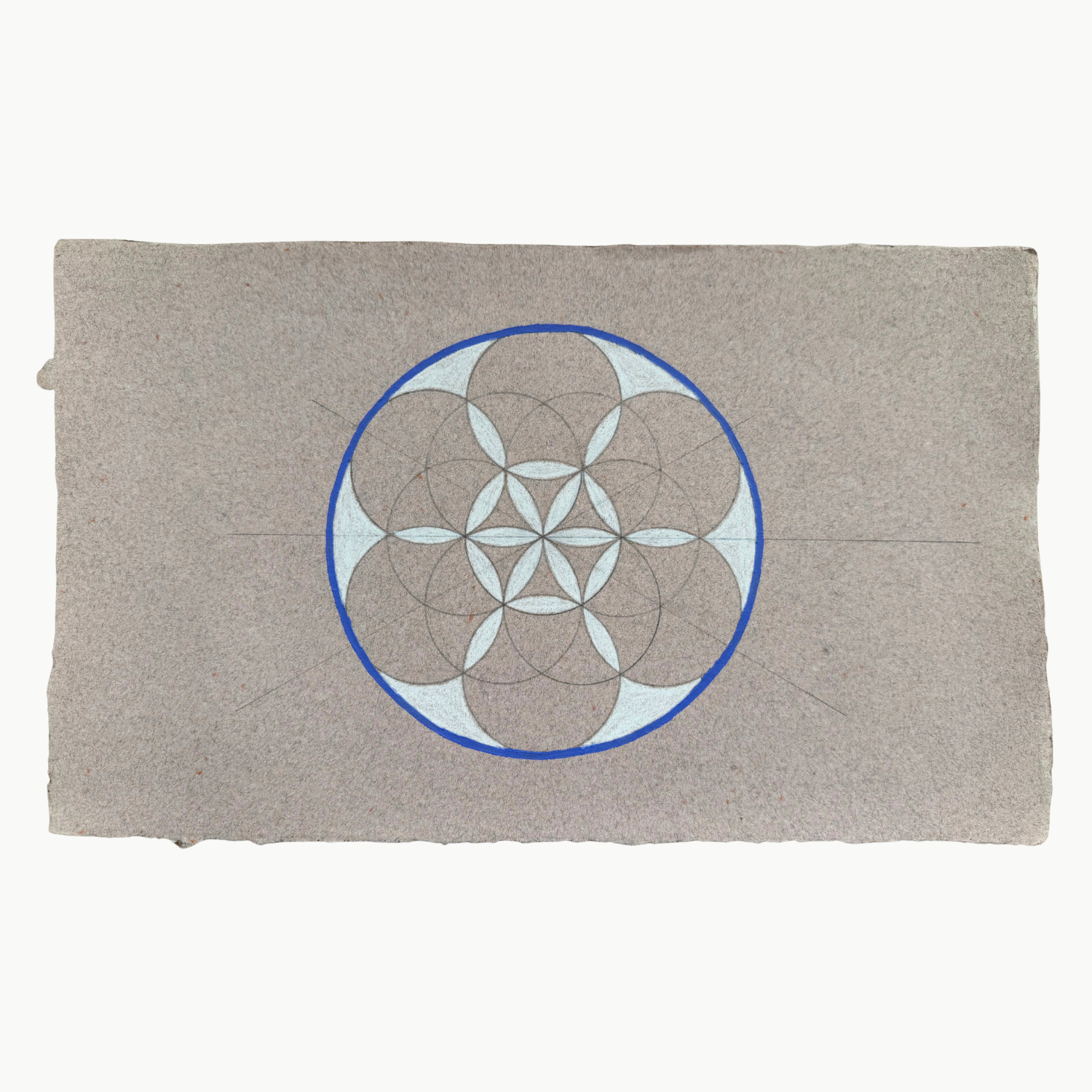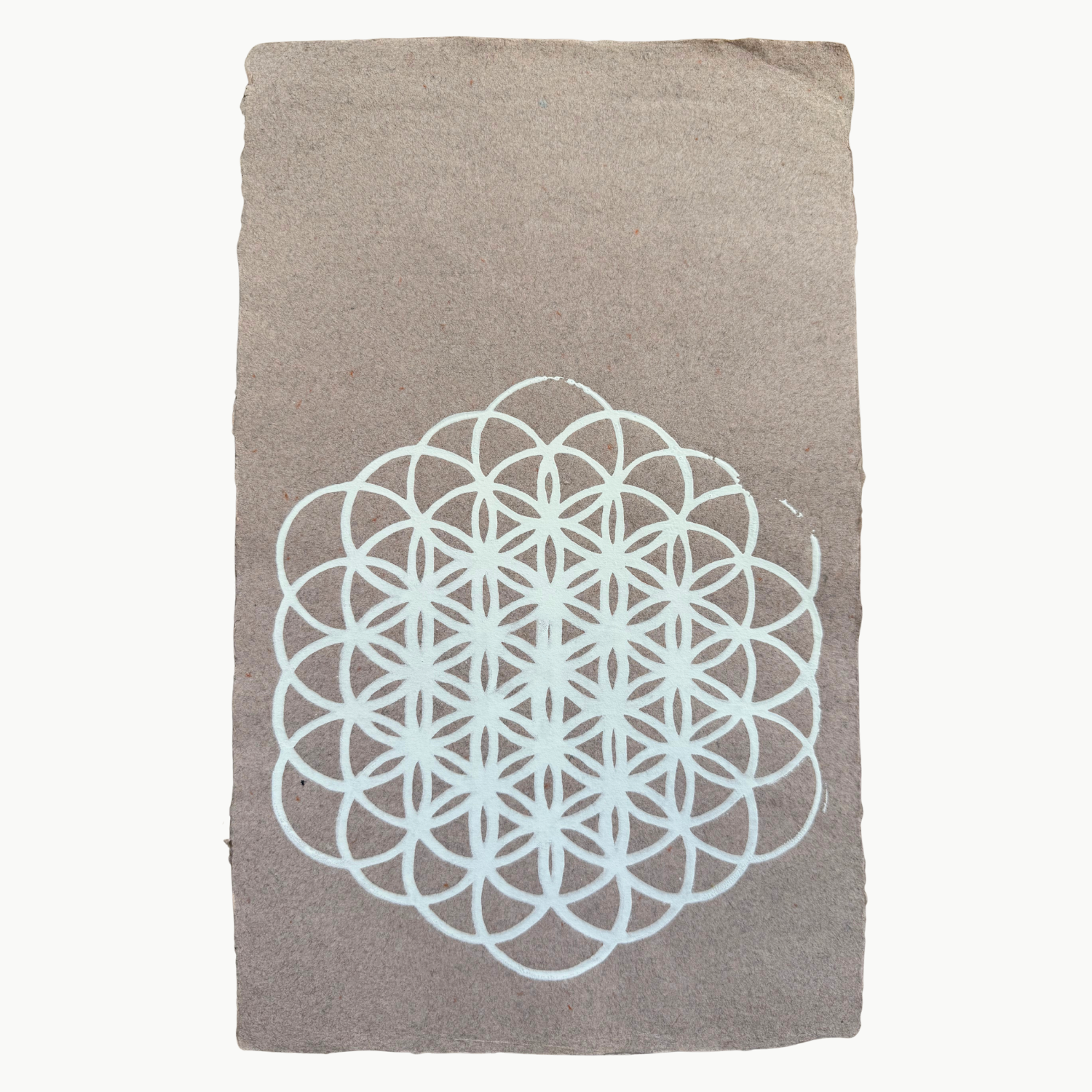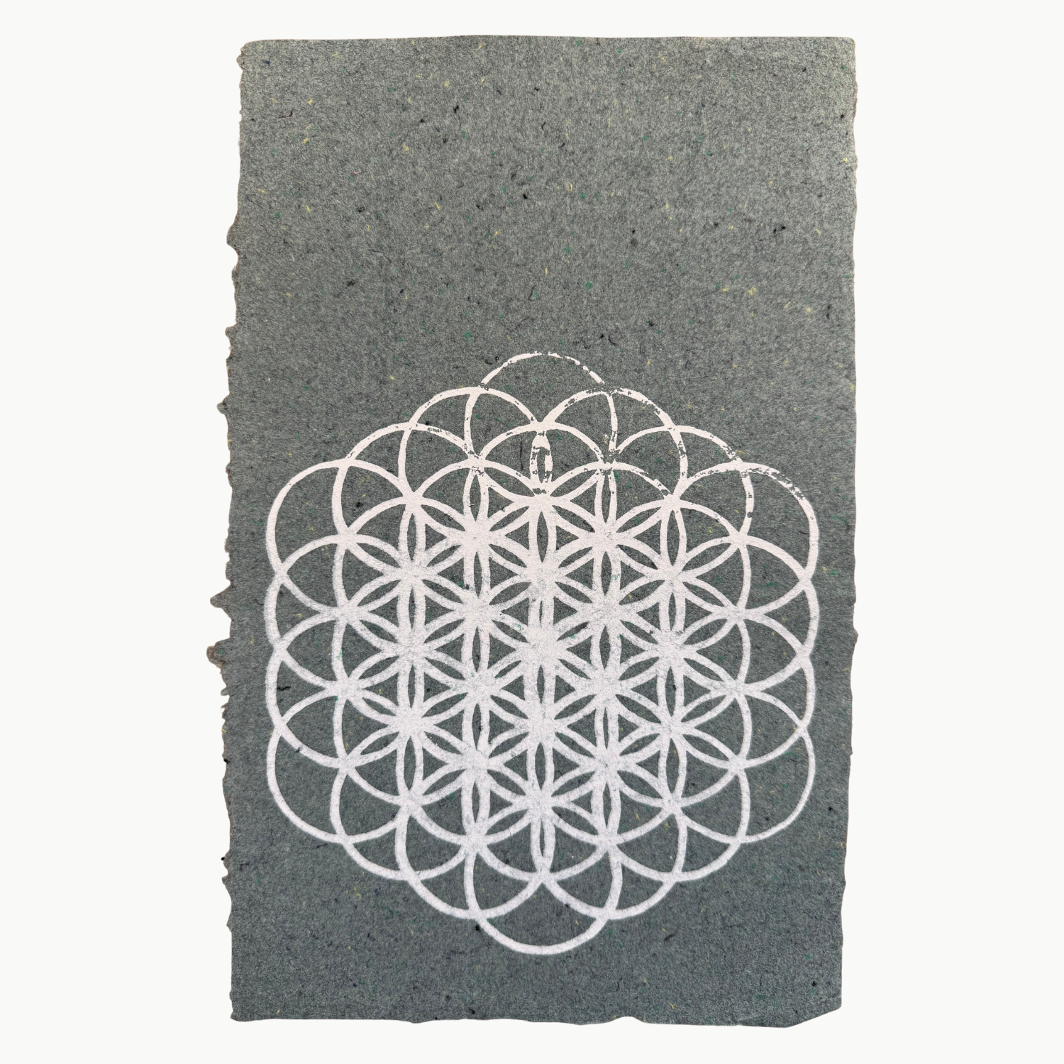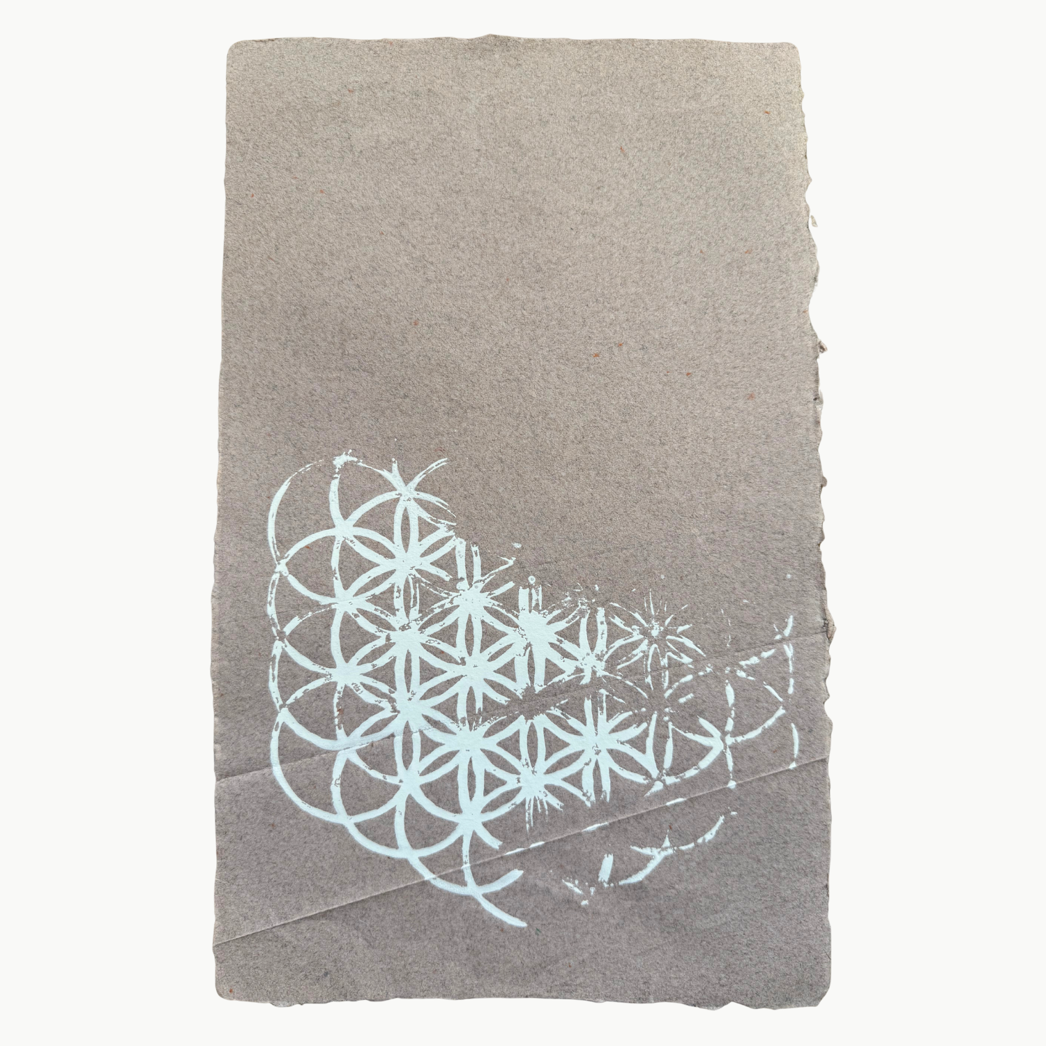 Below: After viewing prints on papyrus and seeing the original Flower of Life in Egypt- I silk screened the flower of life onto my handmade paper. The paper was made from my used cotton clothes naturally creating a mauve and complex blue color. I allowed the silkscreen pulls to fade so that some shapes are incomplete. When grouped together the flower of life seems to hover, fade in and out, or is in between spaces. When you gaze softly at the prints, the intersection points on the print seem to glow or create different shapes.